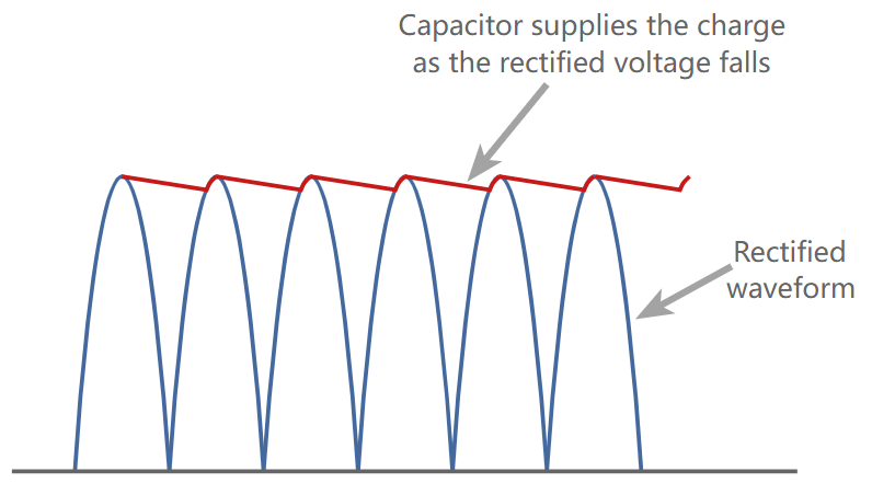 Smoothing works because when the rectifier voltage rises above the capacitor’s voltage, the capacitor charges, and when the rectifier voltage drops, the capacitor provides the required current from its stored charge.